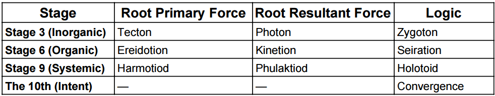 - Stage 3 (Inorganic): The rigid structural floor. It interacts with three forces to establish location and extension.